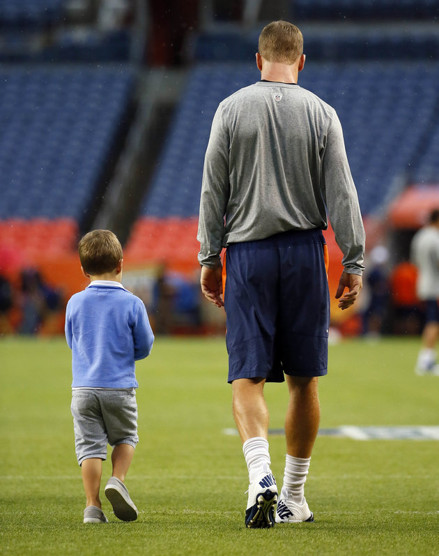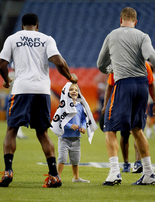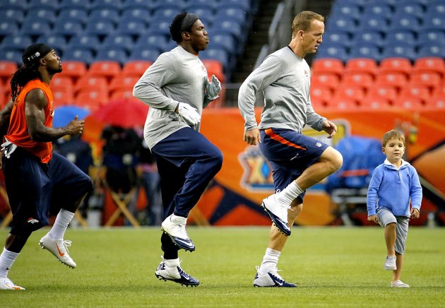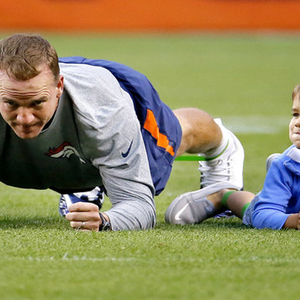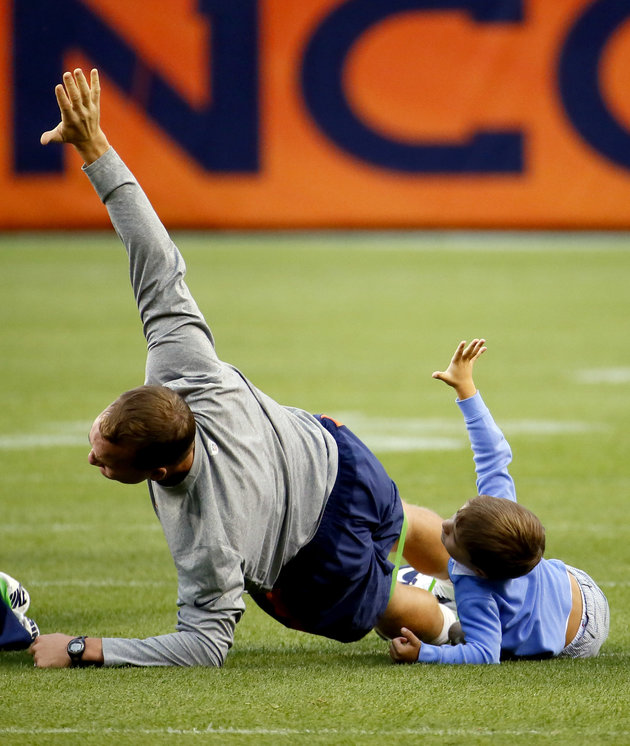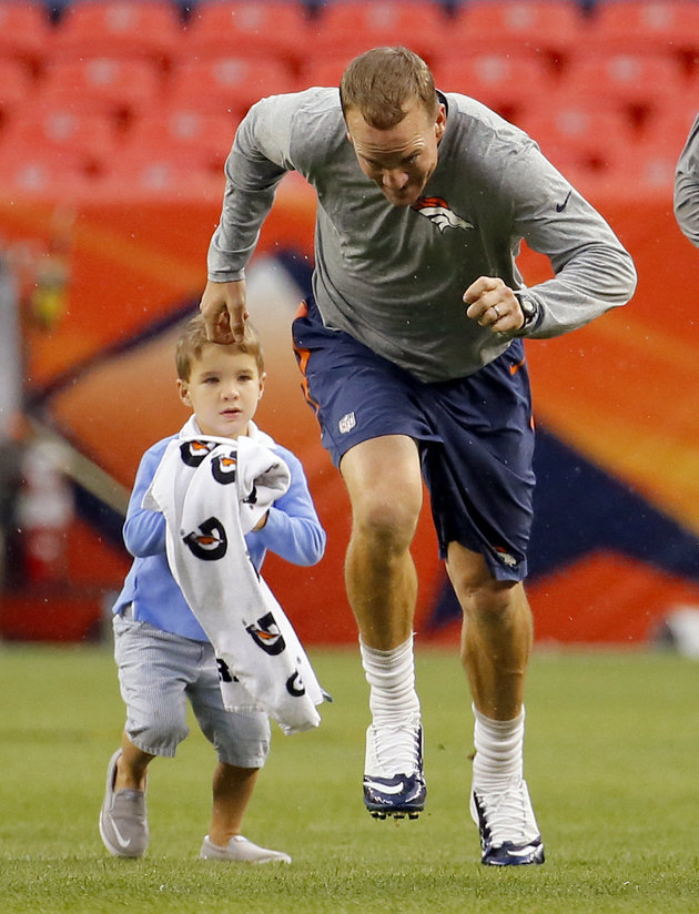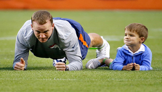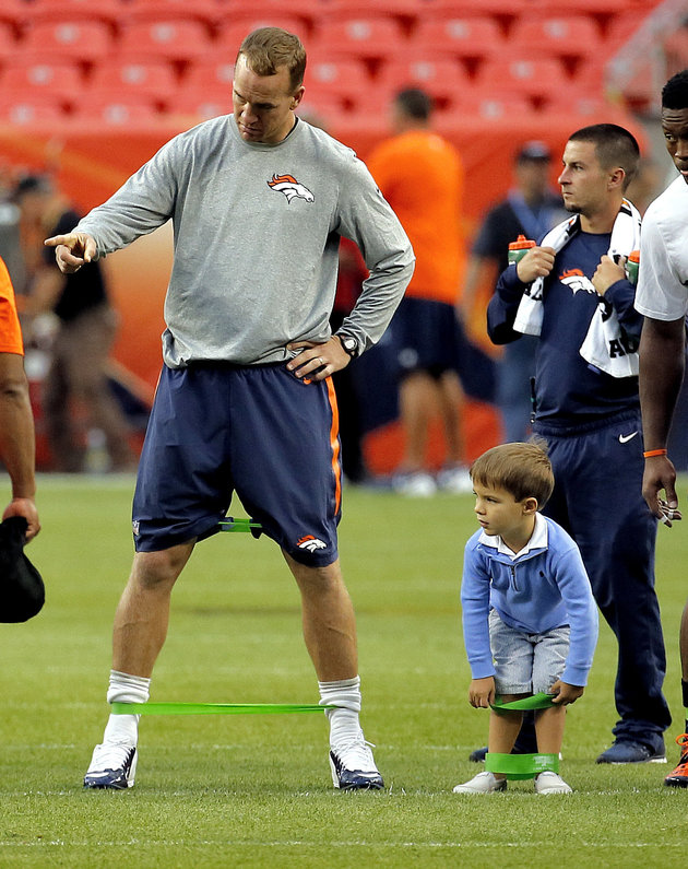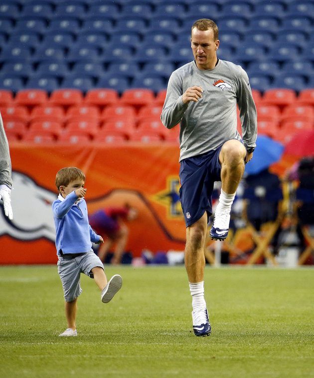 当爸爸是曼宁家族一员时,你就可以在橄榄球场所心所欲做你想做的事情。老二佩顿和老三伊莱都一个职业橄榄球员的耳濡目染下长大,现在轮到了佩顿的儿子马歇尔,是时候该接受一些简单的橄榄球训练了。在周四晚坐镇丹佛迎战亚利桑那红雀之前,四岁的马歇尔陪着佩顿一起在球场做起了的热身运动,整个场面——萌萌哒!