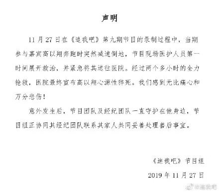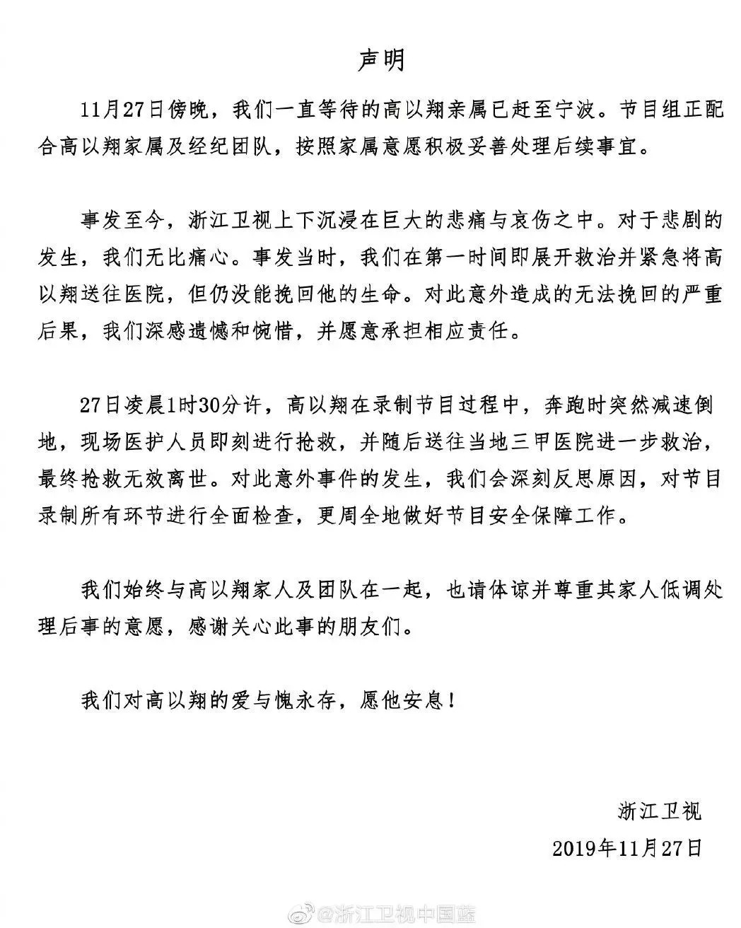 据现场观众透露,此次高以翔参与录制的《追我吧》,从26日21时30分开始左右一直持续到27日1时45分意外发生,期间录制时长近4个小时。正在录制跑步环节的高以翔,在发出一声“我不行了”后随即晕倒。然而不幸的是,送往医院后不久,高以翔还是未能被抢救过来,永远离开了这个世界。而浙江卫视发表的最新声明,表示“愿意承担相应责任”。