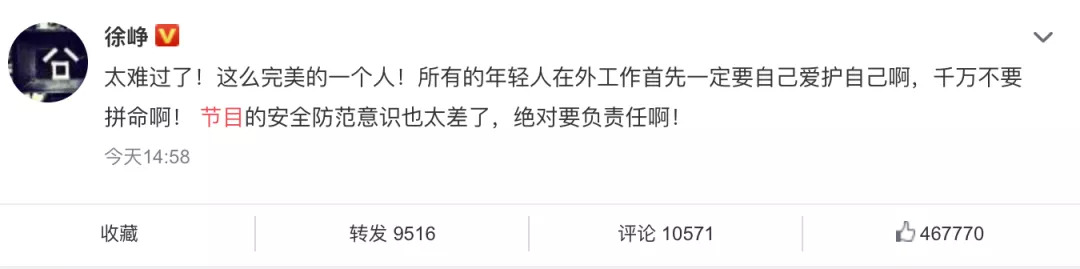 高以翔公司在声明的态度,何尝不是消息确认后公众的第一反应。眼下,舆论矛头顺其自然地指向了高以翔出事时正在参与录制的节目:浙江卫视都市夜景追跑竞技秀《追我吧》。同样,有关户外竞技真人秀管理、艺人工作风险及高强度工作等具有普世性的大众话题,均一一被卷入舆论风暴中心。