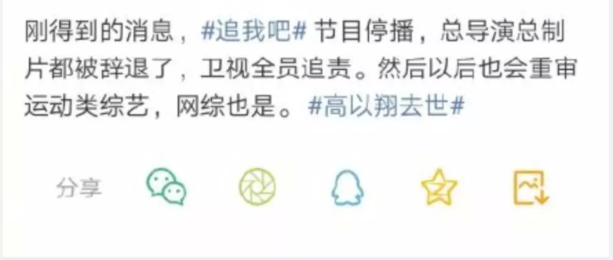 有网友爆料,高以翔事件后,《追我吧》节目停播,总导演总制片均被辞退,卫视全员追责,运动类综艺也将面临更加严格的审查。