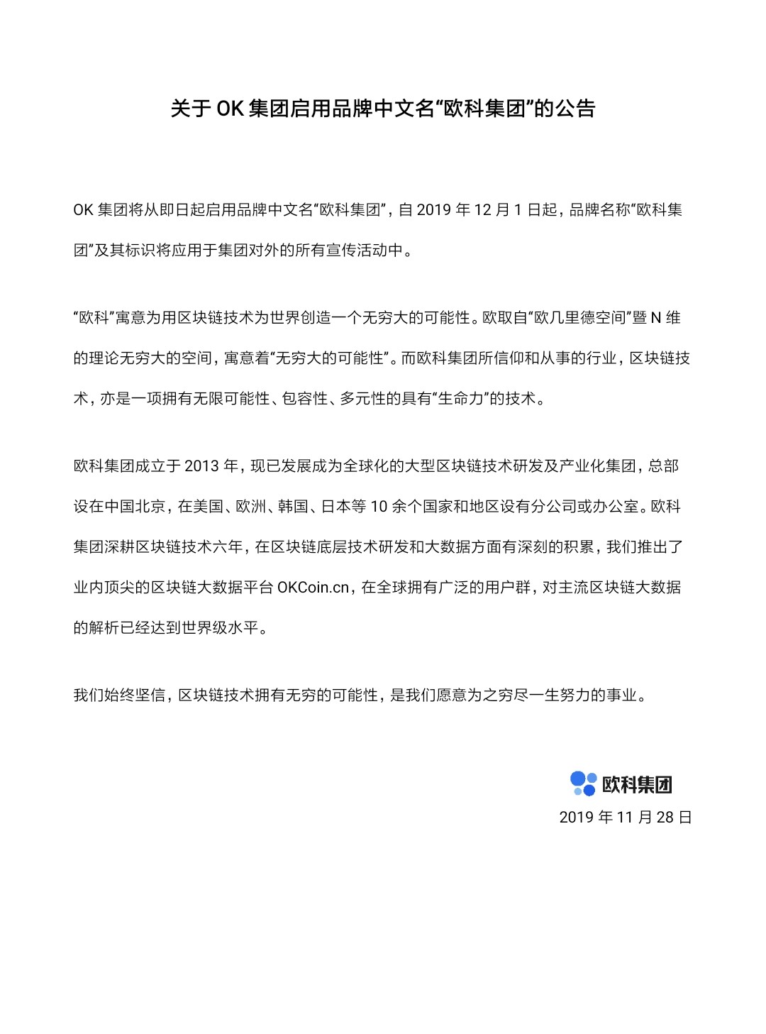 根据其官方资料显示,欧科集团成立于2013年,现已发展成为全球化的大型区块链技术研发及产业化集团,总部设在中国北京,在美国、欧洲、韩国、日本等 10 余个国家和地区设有分公司或办公室。欧科集团深耕区块链技术六年,在区块链底层技术研发和大数据方面有深刻的积累,其推出了业内顶尖的区块链大数据平台OKCoin.cn,在全球拥有广泛的用户群,对主流区块链大数据的解析已经达到世界级水平。