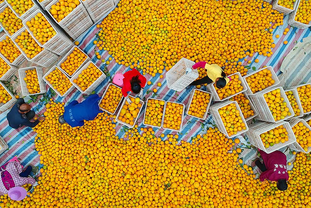 2019年11月27日,江西省赣州市会昌县珠兰乡永记果业种植基地,果农在分拣装运赣南脐橙。