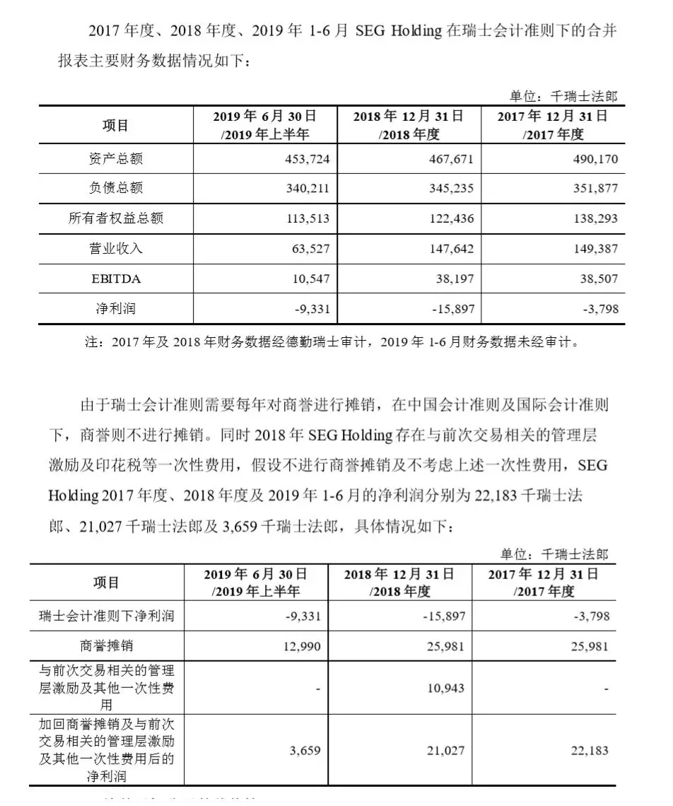 从瑞士会计准则下的净利润看,SEG Holding 2017、2018、2019年上半年依次实现净亏损379.8万瑞士法郎、1589.7万瑞士法郎和933.1万瑞士法郎。亏损幅度大幅增加,2019年上半年净亏损已近2017年全年亏损的三倍。