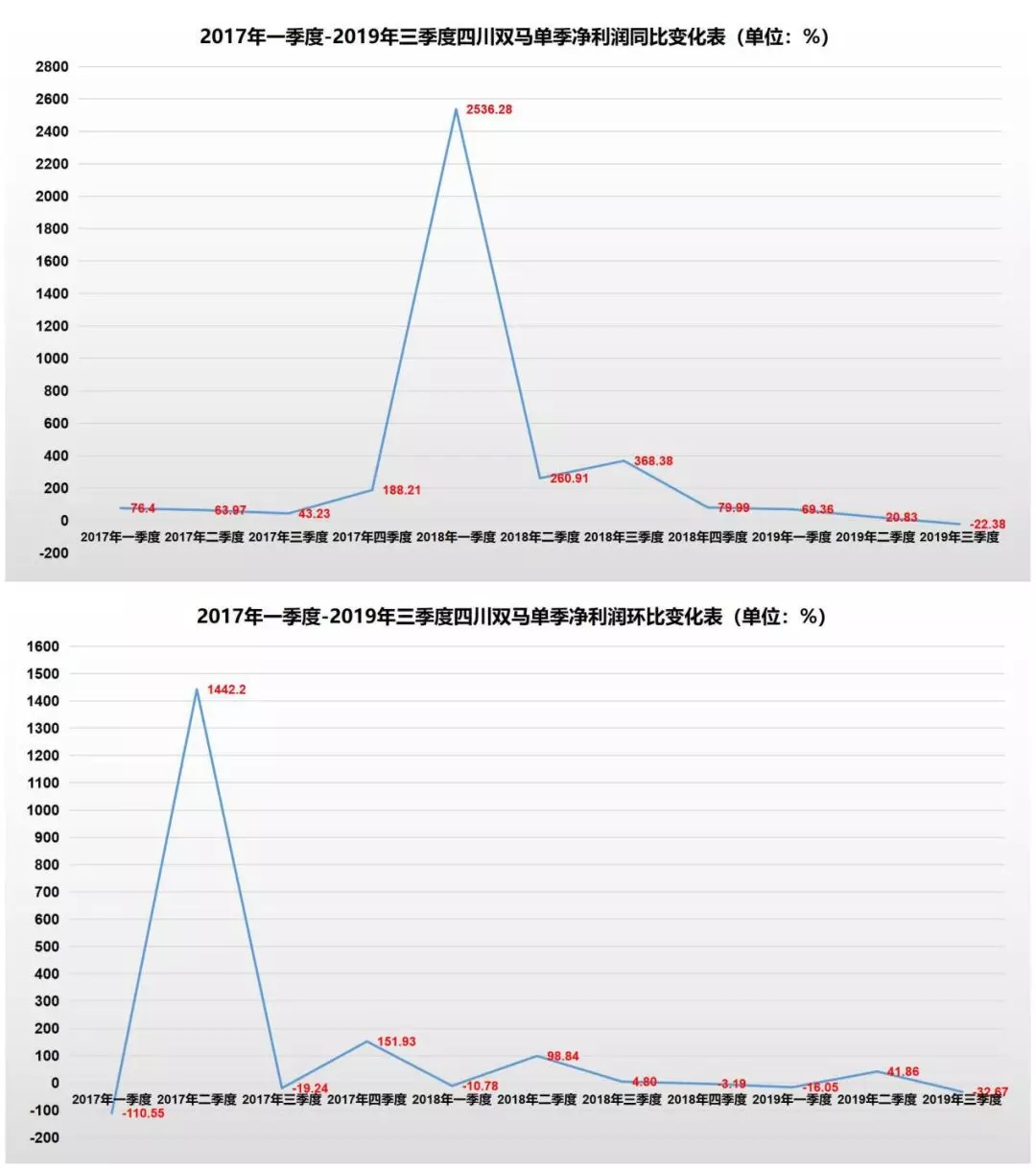 在处置子公司、员工数量大幅减少的同时,四川双马的盈利能力也在降低。蓝鲸教育整理了2017年一季度-2019年三季度,四川双马的单季净利润变化情况。