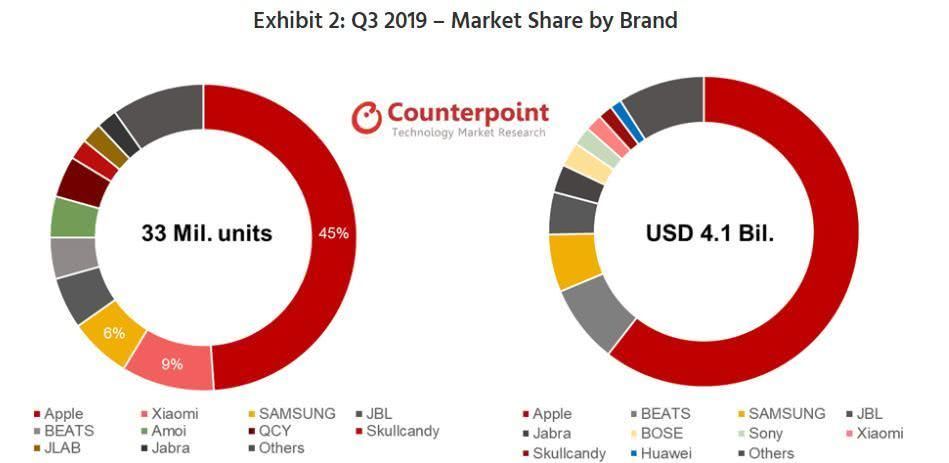 根据Counterpoint的数据,在2019年各季度中,AirPods在全球TWS出货量中的占比不断下降,甚至在最新公布的第三季度数据中,AirPods在全球出货量中的占比已经降至45%。