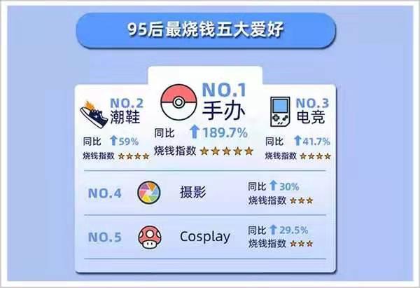 今年8月,天猫发布《95后玩家剁手力榜单》,95后最烧钱的爱好中,潮玩手办位居首位。其中,盲盒收藏异军突起,成为核心玩家增长最快、烧钱最迅猛的领域。