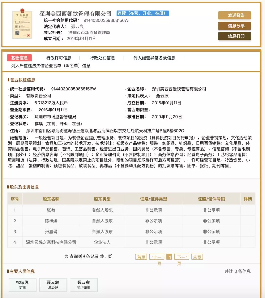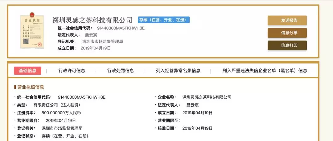 另一方面,本次美西西股东名单新增了一家深圳企业并成为企业法人——深圳灵感之茶科技有限公司——其背后则是聂云宸等人。