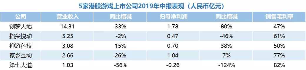 若结合上述五家游戏公司2019年中报进一步分析(中手游、Friendtimes未公布2019年中报),便会发现期内的营收冠军当属创梦天地。在2019年上半年间,该公司实现营收14.31亿元,是其余四家公司的营收之和;实现归母净利润1.78亿元,同比大涨79.54%;