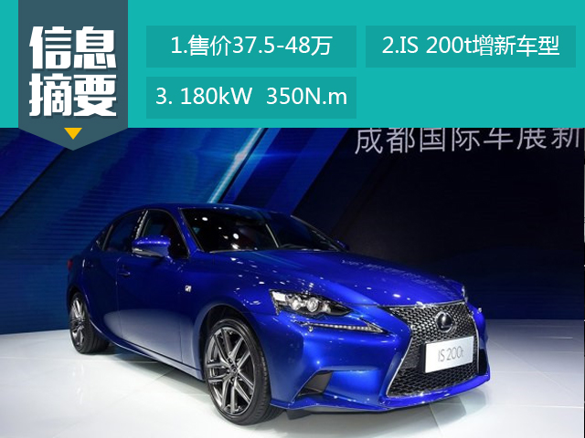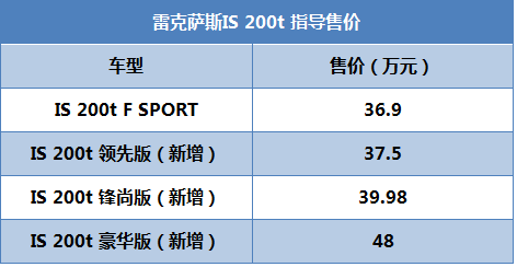 我们通过雷克萨斯官网获悉,雷克萨斯IS 200t新增了三款车型,分别为领先版、锋尚版以及豪华版,新增三款车型的售价为37.5万元-48万元。算上成都车展刚刚上市的F SPORT版本后,雷克萨斯IS 200t全系四款车型的售价区间为36.9万元-48万元。详细售价请见下表: