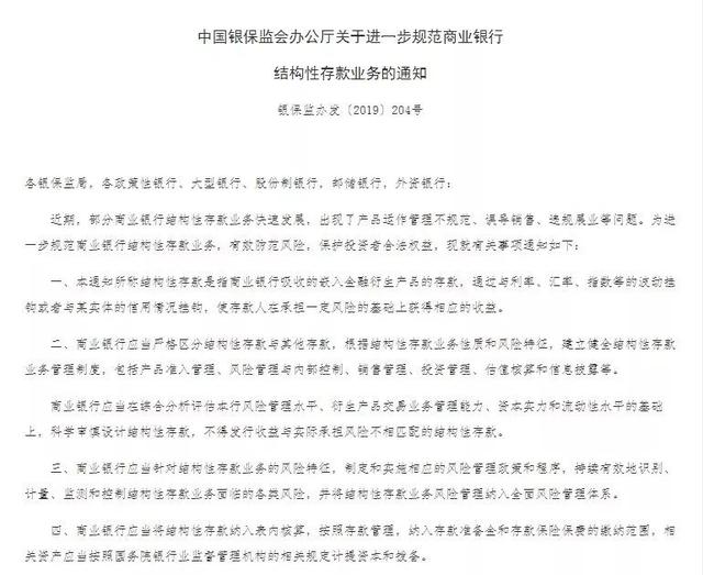 针对结构性存款业务中存在的问题和风险,2019年严监管信号频频释放。