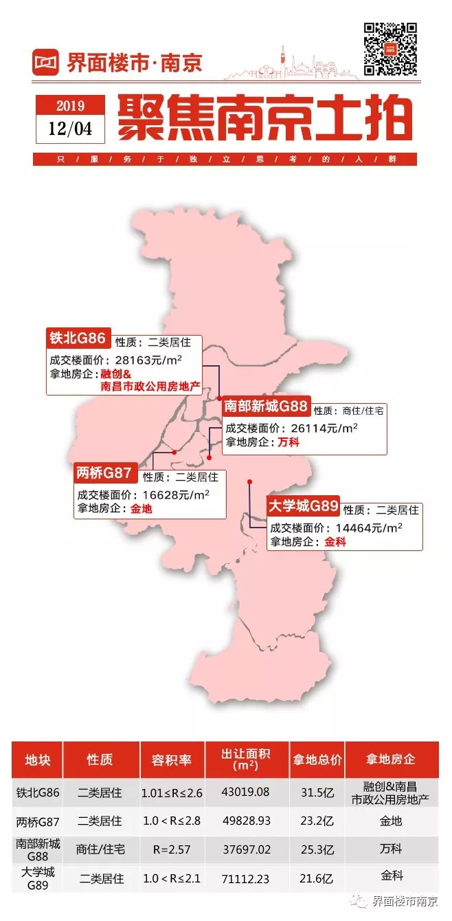 今天(12月4日)迎来本月的第一场土拍,本次共出让4幅地块,分别是铁北G86地块、两桥G87地块、南站G88地块、江宁大学城G89地块,出让总面积超20公顷,起拍总价92.9亿。