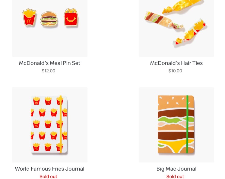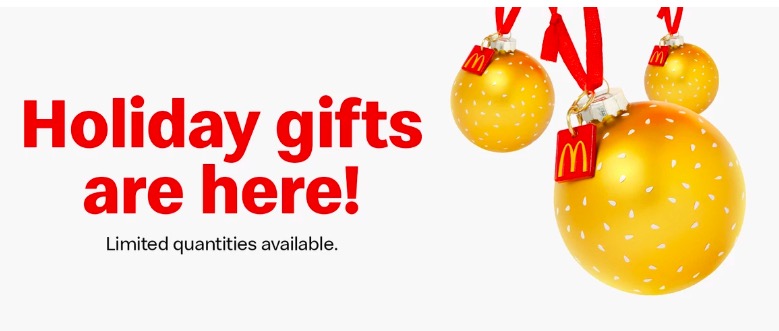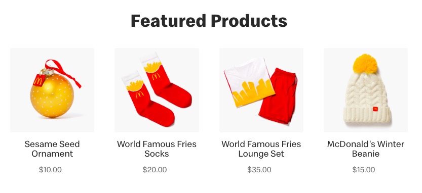 在圣诞购物季来临前,麦当劳建立了一个永久性的网站“Golden Arches Unlimited(金拱门无限)”来专门售卖周边产品:有季节性的应景产品,比如圣诞装饰球、红配绿的圣诞毛衣之类,以及服装和配饰。价格和同类普通商品差不多,比如毛线帽15美元,圣诞装饰球10美元,圣诞毛衣65美元,薯条袜子20美元。汉堡和薯条印花的笔记本已经告罄了。