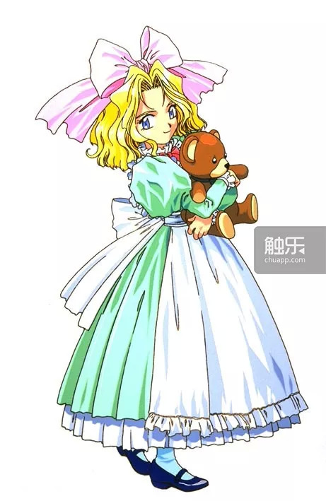 藤岛康介收到的人设指示为“一个洋娃娃式的小萝莉”,设定图也确实出现了洋娃娃般蓬松的围裙、头发,以及硕大的蝴蝶结。