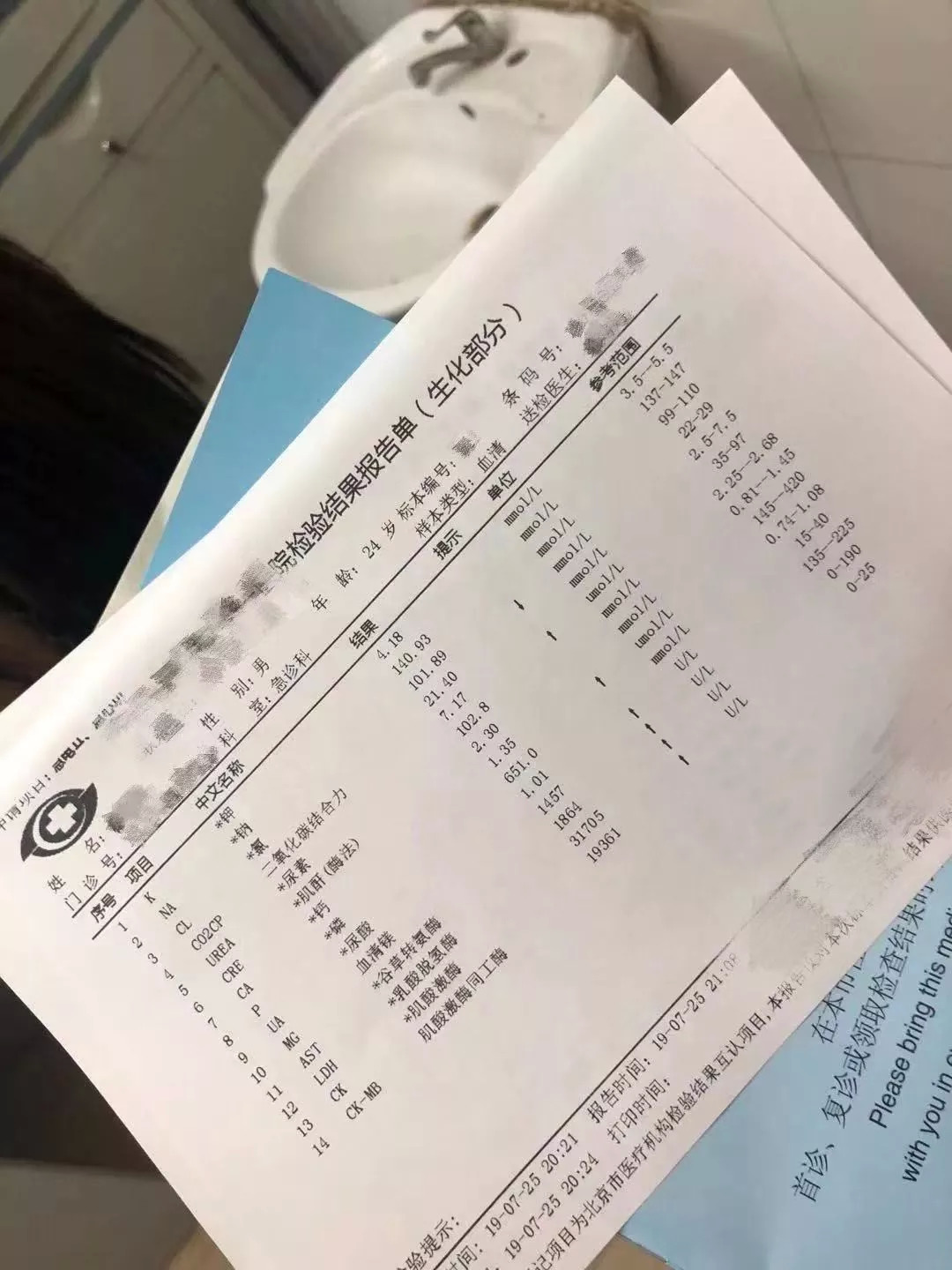 7 月 27 号,骑完动感单车的第五天,杨昊然再次进行生化检查,肌酸激酶已经达到了 42670 U/L,甚至超过了医院能测得的最大量程。