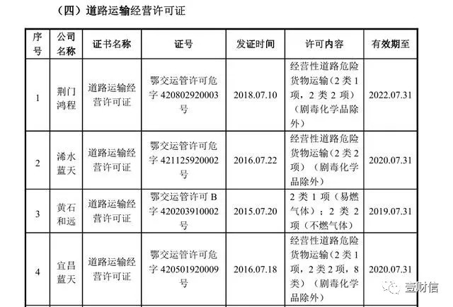 值得注意的是,招股书中披露浠水蓝天和宜昌蓝天分别是在2016年7月22日和2016年7月18日获得道路运输经营许可证,而道路运输经营许可证是地方道路运输管理部门颁发的证件,有效期为4年到期需换证。前述交通事故发生在2016年7月13日,是在两公司获得道路运输经营许可证之前,彼时两公司是否有道路运输经营许可证我们也不得而知,否则浠水蓝天员工驾驶宜昌蓝天公司重型罐式半挂车发生交通事故或为无证上路。对此问题,《壹财信》曾发函求证,但截至发稿也都没有回复。
