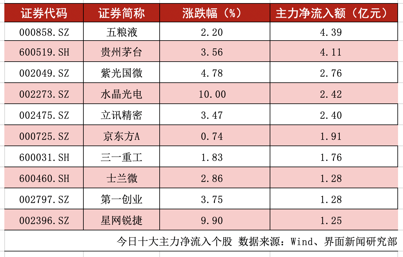 剔除尚未开板的新股及科创板股票,全天沪深两市主力净流入额超过1亿元的个股数量为15个。五粮液(000858.SZ)、贵州茅台(600519.SH)、紫光国微(002049.SZ)的主力净流入额位居前三,分别为4.39亿元、4.11亿元、2.76亿元。