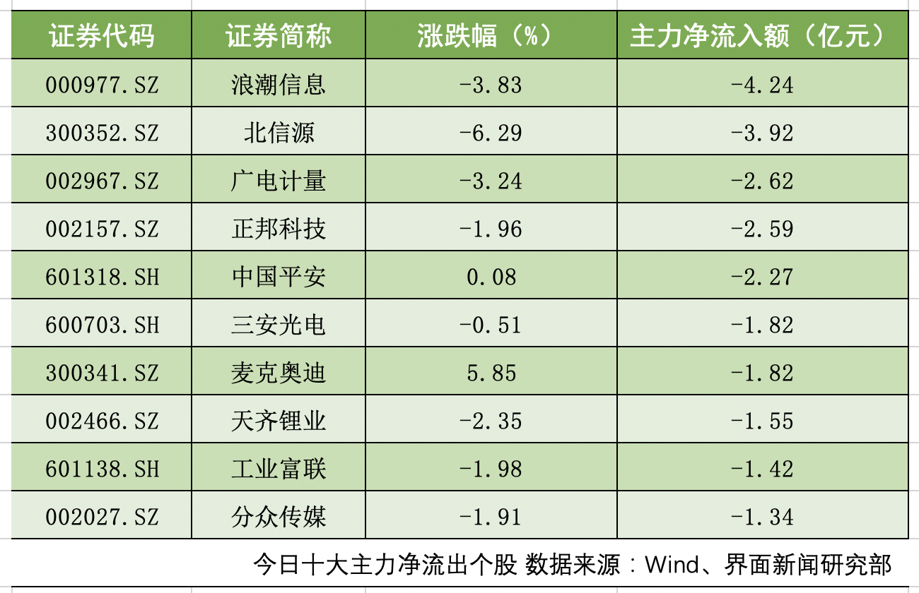 沪深两市共计17只个股主力净流出额超1亿元。浪潮信息(000977.SZ)、北信源(300352.SZ)、广电计量(002967.SZ)主力净流出额位居前三,分别为4.24亿元、3.92亿元、2.62亿元。