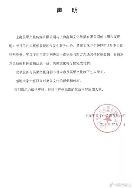 而“综N代”的问题还未梳理清晰,这档节目却因其他负面新闻备受关注。日前,#吐槽大会出品方被列为被执行人#的话题被多个平台推上热搜,消息称,天眼查数据显示,12月3日,《吐槽大会》、《脱口秀大会》等综艺节目的出品方——上海笑果文化传媒有限公司被上海市黄浦区人民法院列为被执行人,执行标的301000元。王思聪的普思资本、李诞均在笑果文化股东之列。