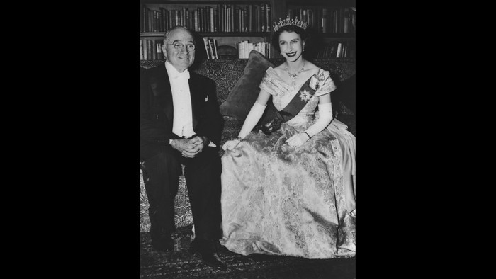 3. 哈利•S•杜鲁门(Harry S. Truman) 在职时间:1945-1953 在1951年的一次国事访问中,当时还是公主的伊丽莎白和她的丈夫菲利普王子受到了当时的美国总统杜鲁门和他的妻子贝斯的招待。杜鲁门是唯一一个在女王登基前与她会面的美国总统。