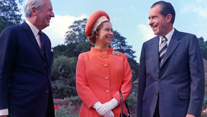 6. 理查德•尼克松(Richard Nixon) 在职时间:1969-1974 尼克松总统也曾和女王会面。1969年他当选第37任美国总统后不久,就对英国进行了非正式访问。当时女王准备了她和菲利普亲王的签名合影作为这次会面的纪念。尼克松也回赠了签名照,“这次的行程太仓促了,所以我没能带着我的夫人一起。不过我们俩都随身带着我们的合影,所以我还有张我们的合影,我想把这个作为纪念品回赠给你们。毕竟看我们俩的合影比看我一个人的赏心悦目一些。”女王回到:“你真是太好了。”