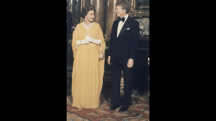 8. 吉米•卡特(Jimmy Carter) 在职时间:1977-1981 1977年白金汉宫的一次外国首脑晚宴中,卡特总统形容女王的家是“我见过的最美的宫殿”,之后他还提到很高兴能见到整个英国王室,“我坐在女王和玛格丽特公主之间,桌子对面就是查尔斯王子和菲利普亲王以及女王的母亲。”之后他还补充道:“我必须要告诉女王,去年她来参加我们的建国200周年纪念日美国人民有多高兴。”女王答道:“美国人民是她见过的最热情的人民之一。”
