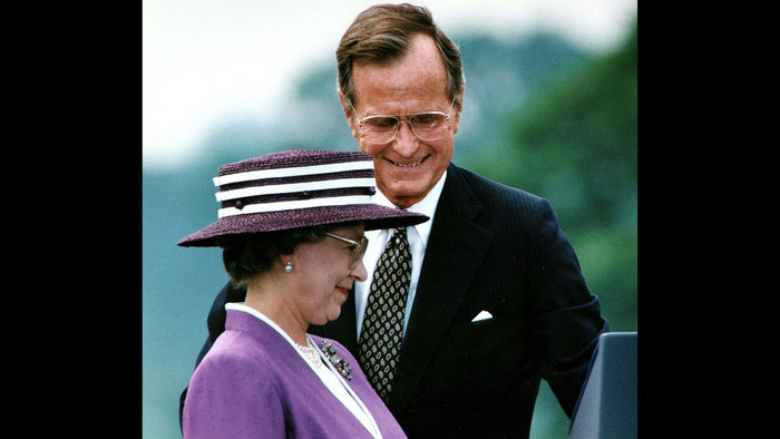 10. 乔治•赫伯特•沃克•布什(George H. W. Bush) 在职时间:1989-1993 布什总统曾在1989年受邀到白金汉宫与女王会面,之后在1991年5月女王又受邀参加白宫晚宴。在祝酒词上,这两位元首颂赞了英国历史上对美国人权和法治的影响,女王还提到了自己之前的几次白宫之旅以及美英外交关系。布什在他的欢迎演讲中提到:“我们有很多的共同点,美国人都像女王一样喜欢马…连接我们两国的不是地理位置,而是理念,美国从英国继承了这些伟大的理念:民主、法治、人权。”