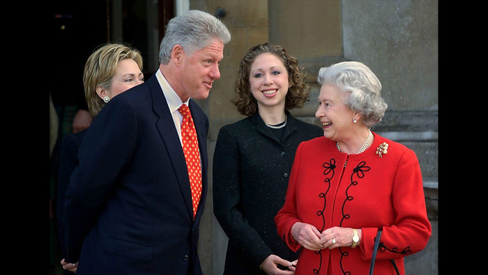 11. 比尔•克林顿(Bill Clinton) 在职时间:1993-2001 克林顿总统在任期中不止一次会见了女王。2000年他曾在白金汉宫中与女王一起喝下午茶,1994年他曾和女王一起参加了诺曼底登陆50周年纪念活动。他在事后曾回忆道:“她是一位非常睿智、充满智慧的女性,她非常了解现在的世界…我们会面时我总是惊叹于她提出的观点,她真的是一位令人印象深刻的女性。我非常喜欢她!”2000年克林顿访问欧洲的时候曾和女王一起喝茶,他注意到虽然女王的头发开始变白,但是她仍有一双“年轻的眼睛”,他曾提到“她淡蓝色的眼睛很有穿透力”。