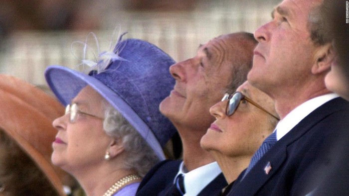 12. 乔治•沃克•布什(George W. Bush) 在职时间:2001-2009 布什总统曾在2003年对英国进行了正式访问,女王在2007年被邀请来美国参加詹姆斯敦400周年纪念日。在布什的欢迎词中,他提到“女王陛下让我们的国家得以庆祝它的200岁生日,在17---”,这似乎是在说女王自18世纪就在位,不过他马上意识到自己的错误,赶紧向女王眨眼以示道歉。之后布什提到:“女王回给我一种妈妈看孩子的眼神。”这张照片为2004年6月在法国阿罗芒什纪念诺曼底登录60周年时所拍。