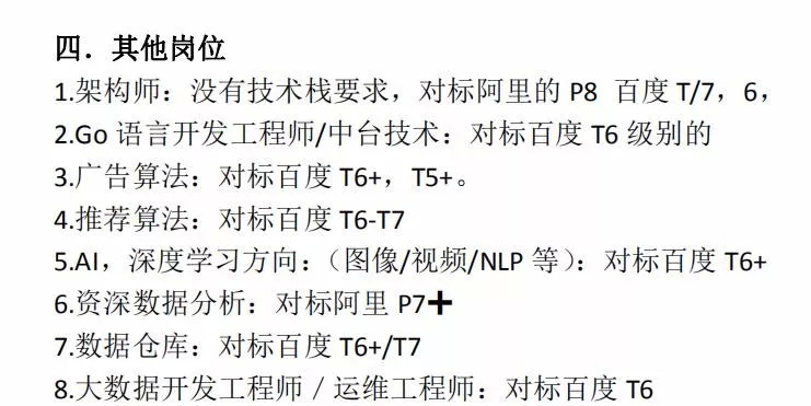 技术开发岗位大多对标是百度的体系标准。在招聘计划中有一串用红色标出的字体极为显眼:从百度 T5+/T6 级别的人选起。以Go 语言开发工程师/中台技术人员为例,对标的是百度 T6 级别,大数据开发工程师/运维工程师对标百度 T6,资深数据分析对标阿里 P7+等。