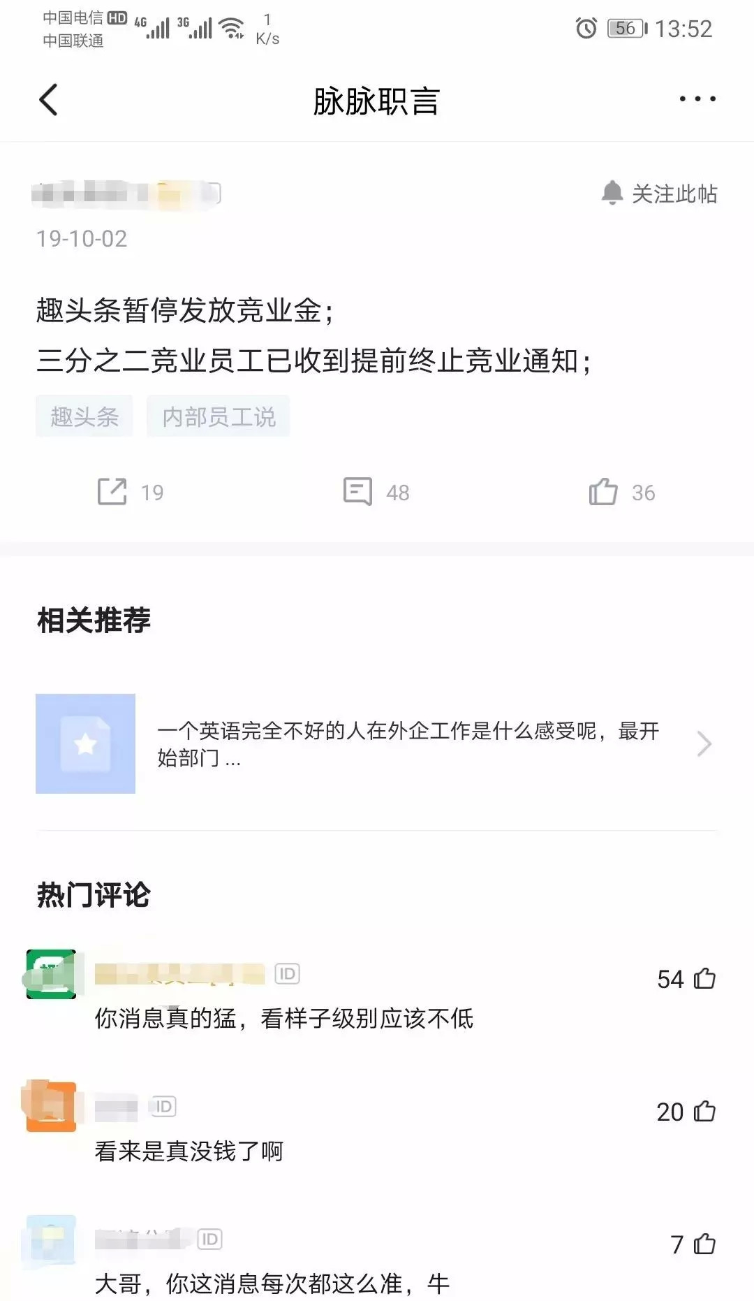 在一波换血之后,趣头条也停掉了允诺给员工的竞业金。10月2日,有趣头条员工在职场社交平台爆料:趣头条暂定发放竞业金,三分之二竞业员工已收提前终止竞业通知。所谓竞业金,即竞业限制补偿金,是指劳动者在一定期限内承担竞业限制业务,用人单位向劳动者支付相应的补偿款。