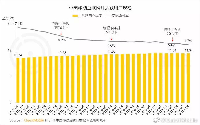 Questmobile数据显示,随着城乡差距的进一步缩短,移动互联网人口红利天花板已至,2019年第二季度,移动互联网用户净减200万,11.38亿的总体用户量已经触及天花板。