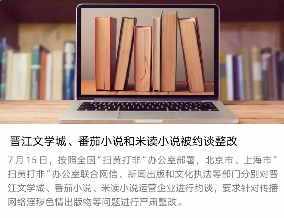 7月15日,根据全国“扫黄打非”办公室部署,北京市、上海市“扫黄打非”办公室联合网信、新闻出版和文化执法等部门分别对晋江文学城、番茄小说、米读小说运营企业进行约谈,要求针对传播网络淫秽色情出版物等问题进行严肃整改。