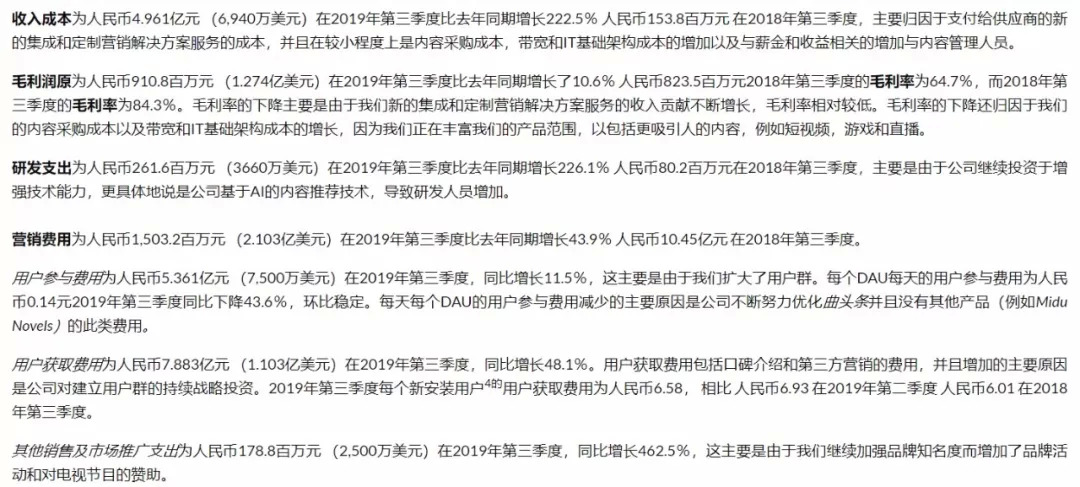 同样不容忽视的是,趣头条的成本支出同样呈现出了高速增长趋势。Q3财报显示,趣头条本季度的营收成本为4.961亿元,同比增长222.5%;销售及营销成本为15.032亿元,同比增长43.9%;此外,其在用户互动方面的指出为5.361亿元,同比增粘11.5%。用户获取支出7.883亿元,同比增长48.1%。