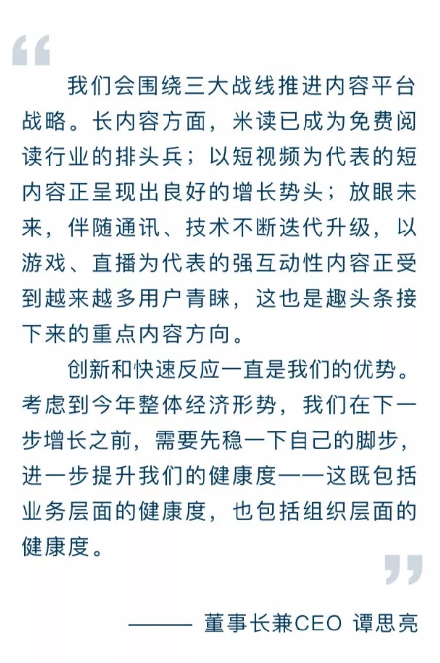 Q3财报公布后,谭思亮表示,新兴市场用户人群及其商业化价值还有着巨大的挖掘潜力。趣头条将继续推进战略性增长,并不断提升平台健康度,以实现长期、可持续性发展。