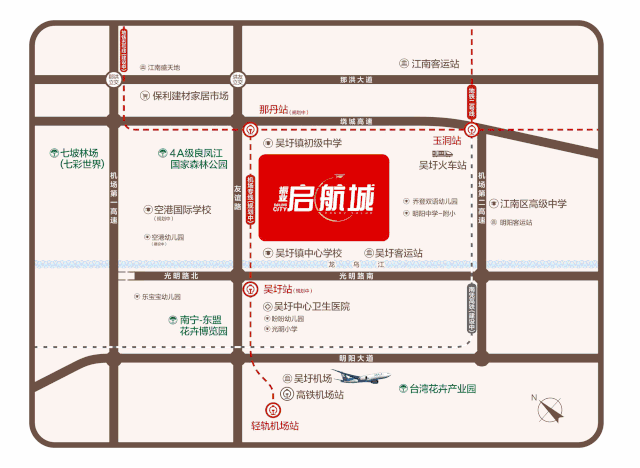 项目位于空港核心居住区,坐拥国际空港综合交通枢纽(预计2022年投用)、吴圩镇初级中学、空港国际学校(规划中)、空港幼儿园(在建)等城市高端配套。国家5A级景区七彩世界森林旅游项目(规划中,原七坡林场)与项目仅一路之隔,万亩园境推窗即赏。同时,项目规划3.3万㎡社区园林,内外景观交相辉映,营造城市桃源居所。