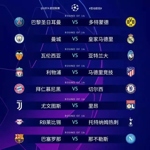 欧冠16强抽签在瑞士尼翁进行,八分之一决赛对阵正式出炉(队名在前者先主后客):