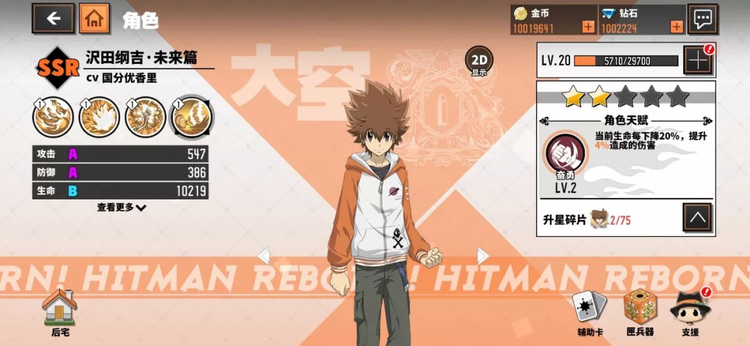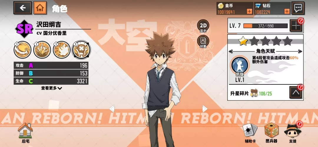 《家庭教师》的做法是,以原作篇章的设定,来作为游戏整体的体验框架。从角色形象、战斗技能以及养成模式,都根据不同篇章的情节和设定,加以区分。以主角纲吉为例,他有日常篇SR和未来篇SSR两个角色,且SSR纲吉并不能通过培养SR纲吉来获得。两个角色从外形到技能乃至战斗数值,都对应原作做了两个不同的版本。即使同样的一个招式,主角的大招“零地点突破”,做了完全不同的释放动作和技能动画。这种渗透到了游戏体验,而不仅仅是美术皮肤上的“情怀”还原,而是让用户通过游戏的方式,体验主角从废柴到彭格列十代目的成长历程。