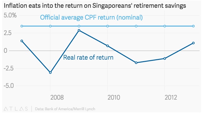 对这个问题的抱怨并不算新奇。新加坡国立大学经济学者Mukul Asher说,如果计入通胀,1987年到2011年间公积金的年平均回报率只有1.4%,仅相当于同期GDP年增长率的六分之一。
