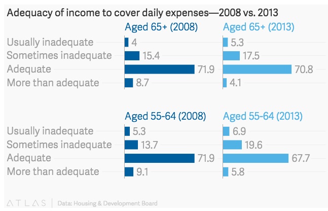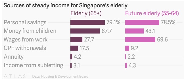 多数老年人都依赖公积金之外的其他收入来源。政府调查发现,对老年人来说,个人存款和来自孩子的供养是比公积金大得多的财务来源。汇丰的一项调查显示,三分之二的新加坡人打算主要依靠现金存款来度过退休生活,而不是养老金。