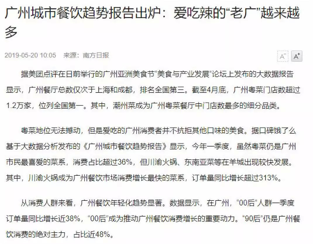 甚至连广州人也爱吃辣了。《广州城市餐饮趋势报告》显示,川渝火锅成为广州餐饮市场消费增长最快的菜系,订单量同比增长超过313%。