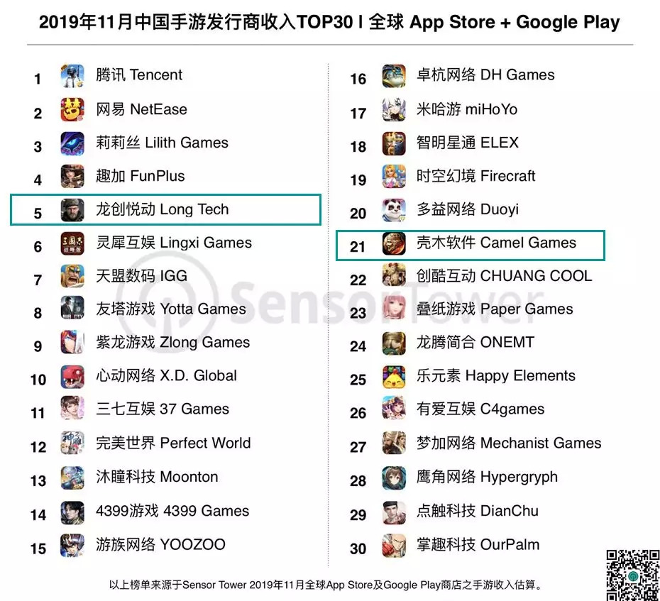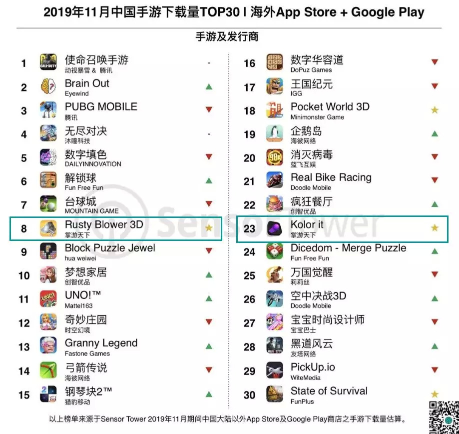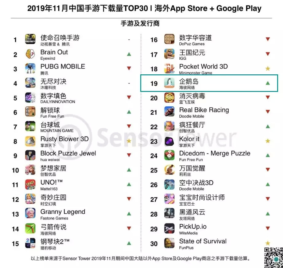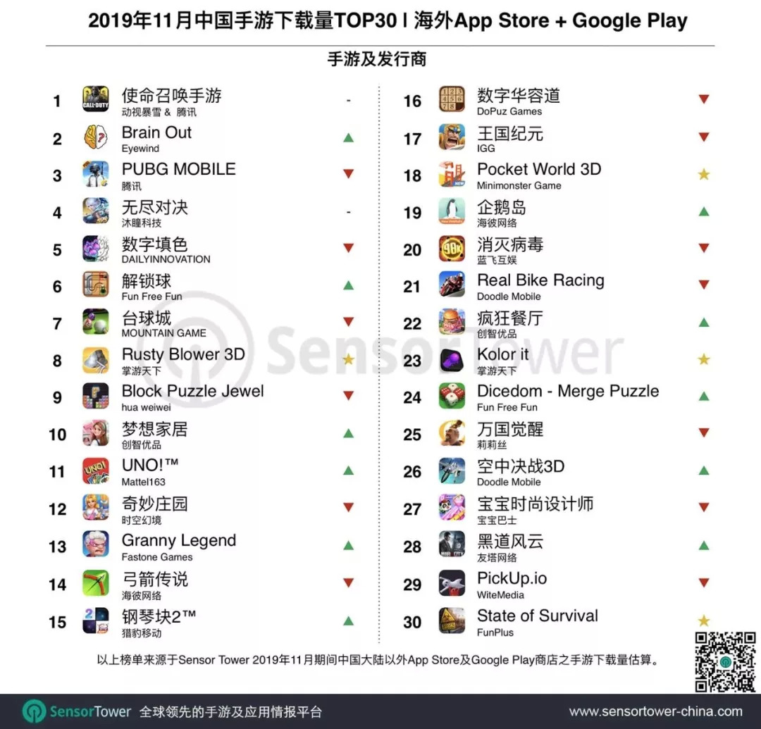 今天(12月17日),数据分析公司SensorTower发布了2019年11月中国游戏出海报告,报告揭示了11月中国手游在海外的下载量TOP30。