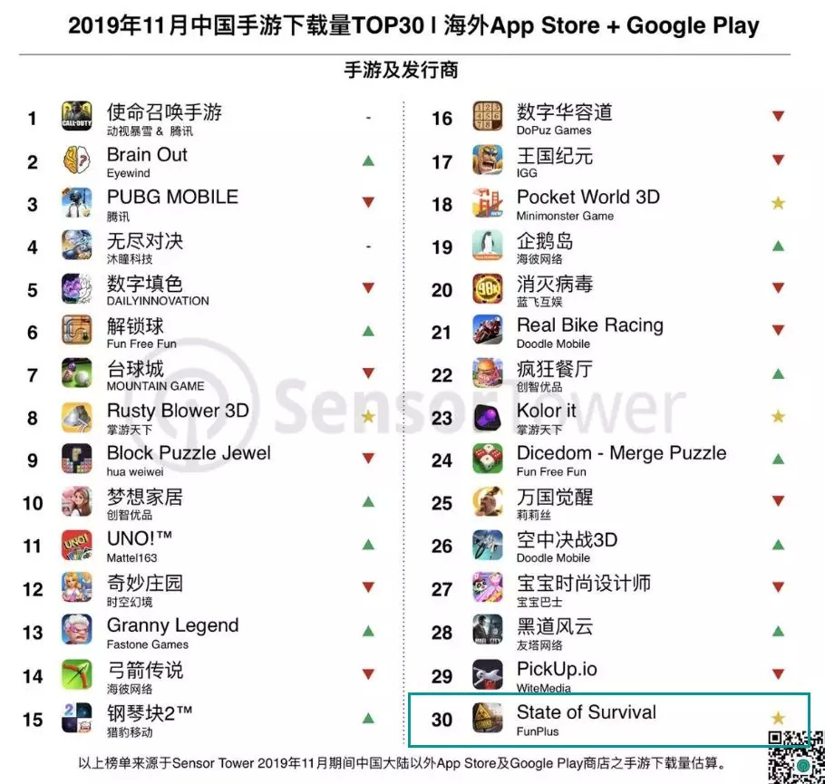 本期榜单一共有4款新上榜游戏,分别是《Rusty Blower 3D》《Pocket World 3D》《Kolor it》和《State of Survival》。其中,《State of Survival》为SLG大厂FunPlus推出的末日生存类SLG游戏,目前游戏收入已经远超龙创悦动《守望黎明》的同期数据,市场潜力惊人。而风眼科技的《Brain Out》下载量超越《PUBG Mobile》拿下榜单TOP2,成为近期新的爆款国产超休闲手游……