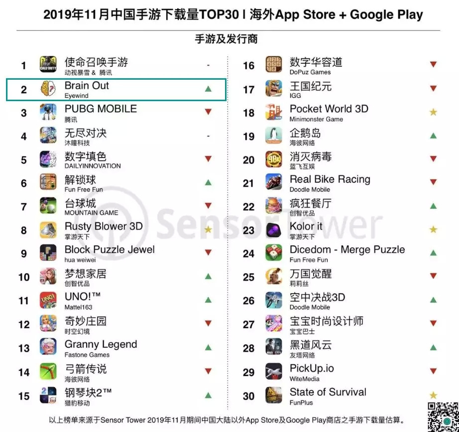 SensorTower数据显示,《Brain Out》(中文名:脑洞大师)11月的海外下载量增长至2033万,超越《PUBG Mobile》拿下了出海下载榜第2名,同时还位列11月全球手游下载量TOP5的位置。