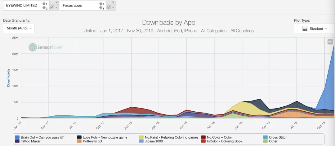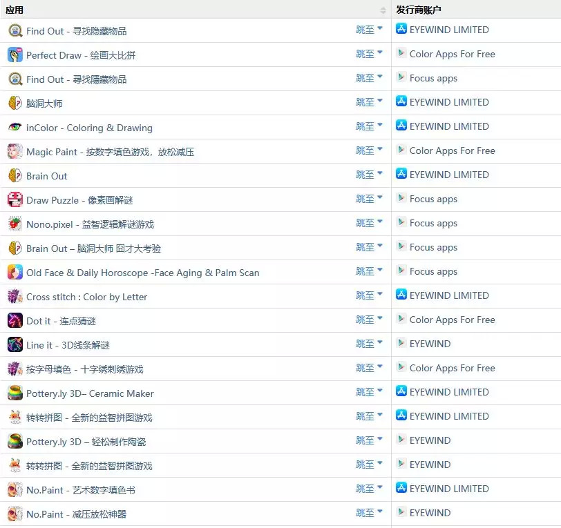 打造了爆款超休闲游戏《Brain Out》的风眼科技,却也是个十分低调的厂商。手游那点事在App Annie上查询到,这家游戏厂商从2017年9月开始推出游戏产品,目前一共有51款应用(包括同一产品不同版本),基本为休闲游戏,并且集中在解谜、3D拼图、填色等玩法类型。