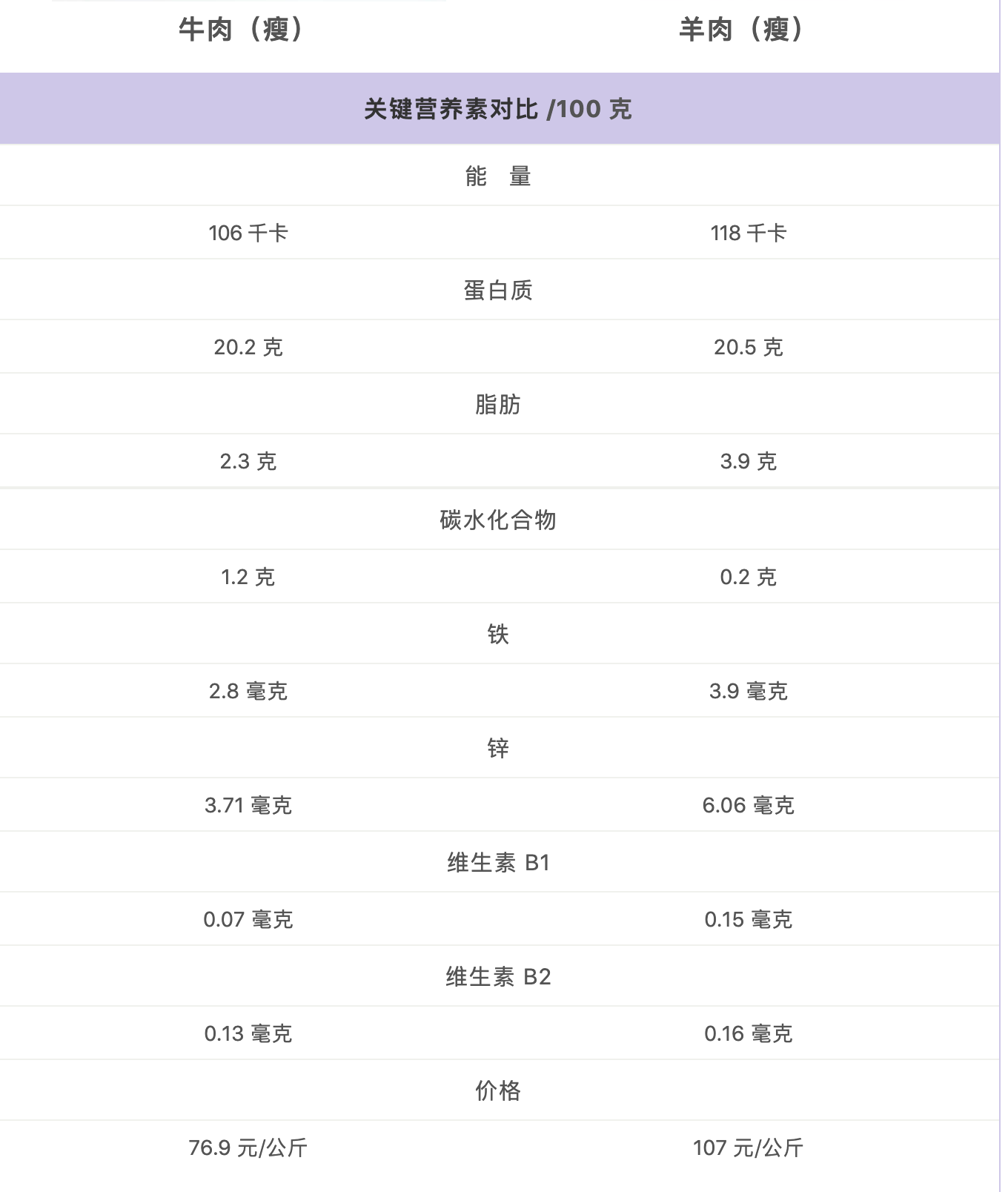另外,羊肉中的维生素 B1、B2 的含量也比牛肉更高。这么看来,羊肉贵的有道理了。
