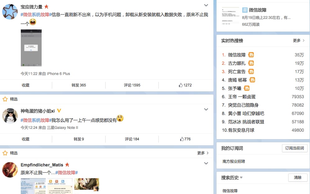 即使在周末,微信也影响了很多人的生活。在问题不到2个小时内,“微信故障”这一话题迅速攀升至微博话题榜第一名,话题参与人数35万。有网友反应,“微信一崩溃,整个人都不好了”、“折腾了一上午还没好,真的很焦虑”。