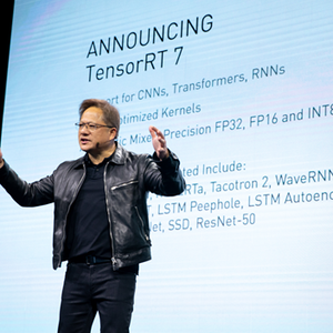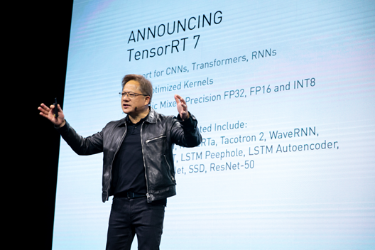 此外,英伟达还正式宣布推出第七代推理优化软件Tensor RT 7。借助于该软件,全球各地的开发者都可以实现会话AI应用,大幅减少推理延迟。会话AI需要在短时间内快速处理,Tensor RT只需300毫秒就能完成这种复杂的计算,速度比CPU快10倍,这种反应速度让AI会话应用具备更强的实用性。黄仁勋称,Tensor RT 7能支持1000多种不同计算变换和变化,是一种巨大的飞跃。