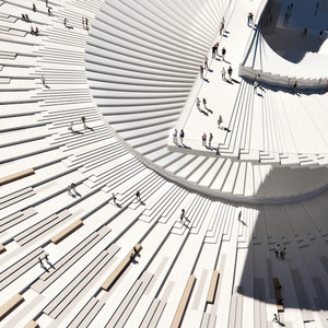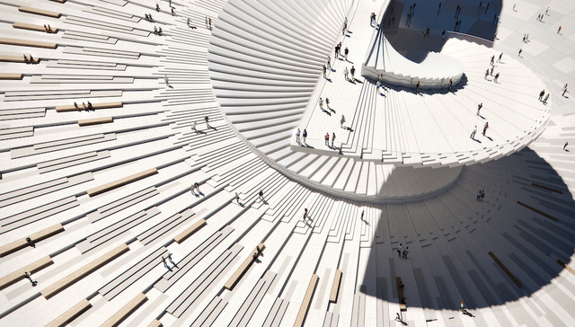 3. 动态的螺旋屋盖既是外观又是空间。外观上,上海大歌剧院连接大地和天空,立足于城市又面向城市,为人们创造出别样景致。同时螺旋屋盖也是面向公众的舞台,既能满足大型活动的使用需求,又能为市民或游客的日常参观提供乐趣。