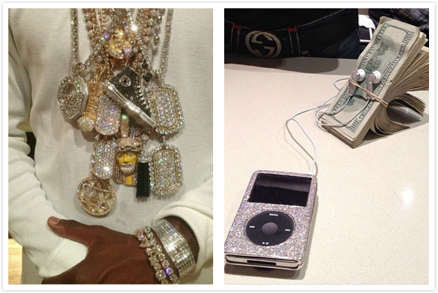 7. 首饰—— 金银钻石等首饰是富豪们必不可少的装饰物,但梅威瑟可能觉得脖子上只戴一条大金链子太寒酸了——对于他来说,要戴就戴一打链子,这才能显得自己与众不同。 除了他本人,他还照顾到了自己IPod的需要,给它也装上了一个钻石保护套,可谓十分体贴。