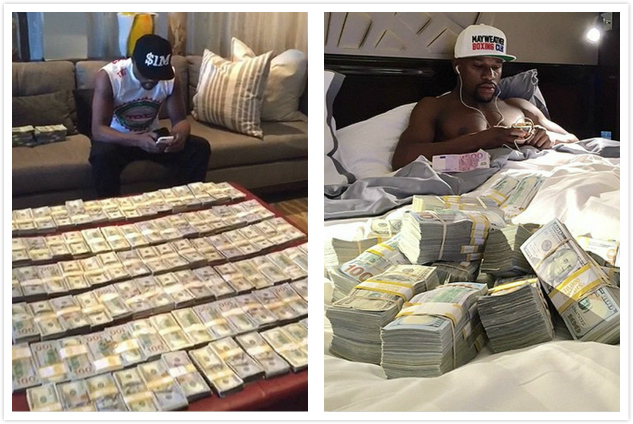 9. 现金—— 最赤裸裸的炫富,还是把一沓沓的钱堆起来,一张张地慢慢数。梅威瑟十分明白这一点。在飞机上、在汽车里、在自家的床上……我们能看到他随时随地点算自己现金的照片。这才是真正的“有钱任性”。